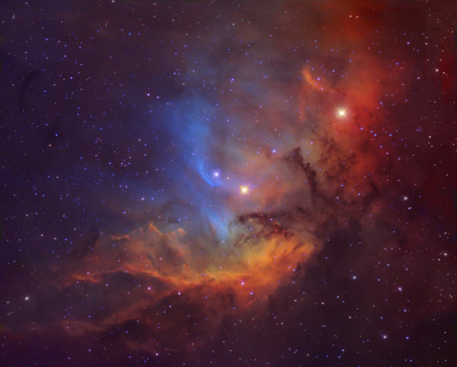 La bella i complexa nebulosa es mostra aquí en una imatge composta en què les emissions de sofre ionitzat, d’hidrogen i d’àtoms d’oxigen es corresponen amb els colors vermell, verd i blau.
