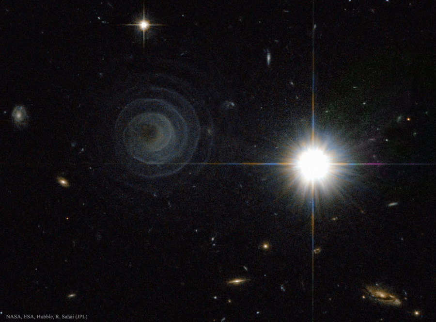 Què és el que va crear l’estranya estructura espiral de l’esquerra? Ningú n’està segur, però segurament està relacionat amb una estrella d’un sistema binari que està entrant en la fase de nebulosa planetària, quan expulsa la seva atmosfera exterior.