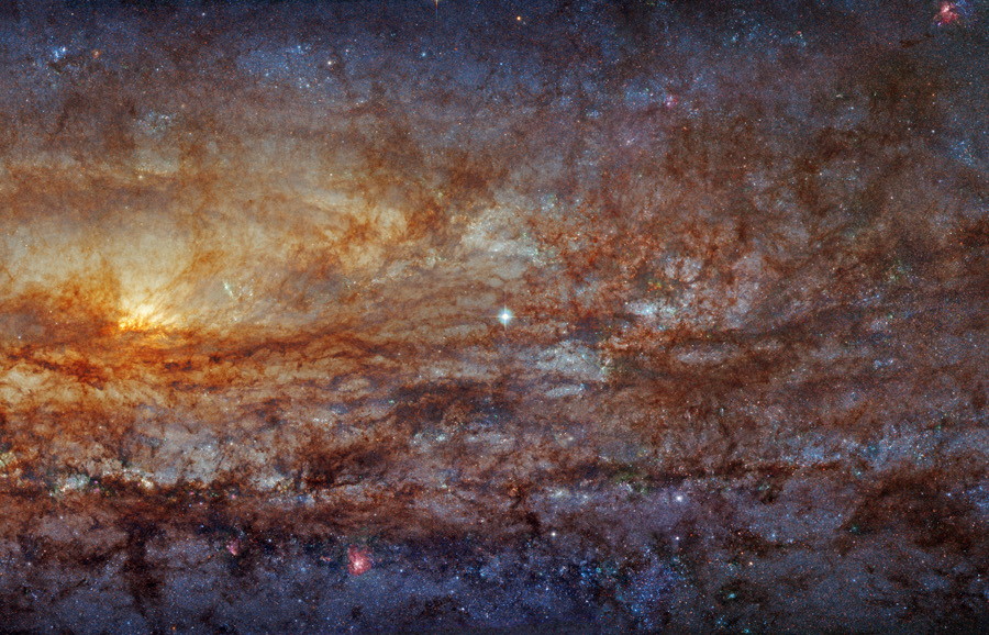 Començant a l’esquerra, a prop del nucli de la galàxia, el panorama mostra filaments de pols, núvols de gas interestel·lar i, fins i tot, estrelles individuals (a la dreta). L’últim fotograma s’ha comprimit una mica per a poder visualitzar un intrigant parell de galàxies en interacció que hi ha en segon pla.