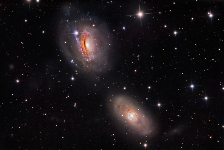En aquesta escena còsmica que té lloc a uns 70 milions d’anys llum de distància, a la tènue constel·lació Sextants i sota la brillant estrella Regulus, la galàxia espiral NGC 3169 sembla estar desintegrant-se. Els seus bonics braços espirals es deformen en cues de marea mentre NGC 3169 (a dalt) i la veïna NGC 3166 interactuen gravitatòriament, un destí comú fins i tot per les galàxies de l’univers local. De fet, els extensos arcs estel·lars i els plomalls que indiquen les interaccions gravitatòries semblen descontrolats en aquesta fotografia del grup de galàxies.