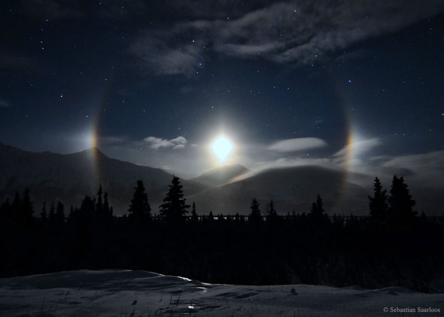 En aquesta imatge nocturna captada el gener de 2013 des de Lower Miller Creek (Alaska, EUA), la llum de la Lluna il·lumina la terra nevada i el paisatge celeste. Prop de l’horitzó muntanyós de ponent s’hi veu un sobreexposat quart creixent de la Lluna envoltat per un halo de gel i flanquejat a dreta i esquerra per uns paraselenes.