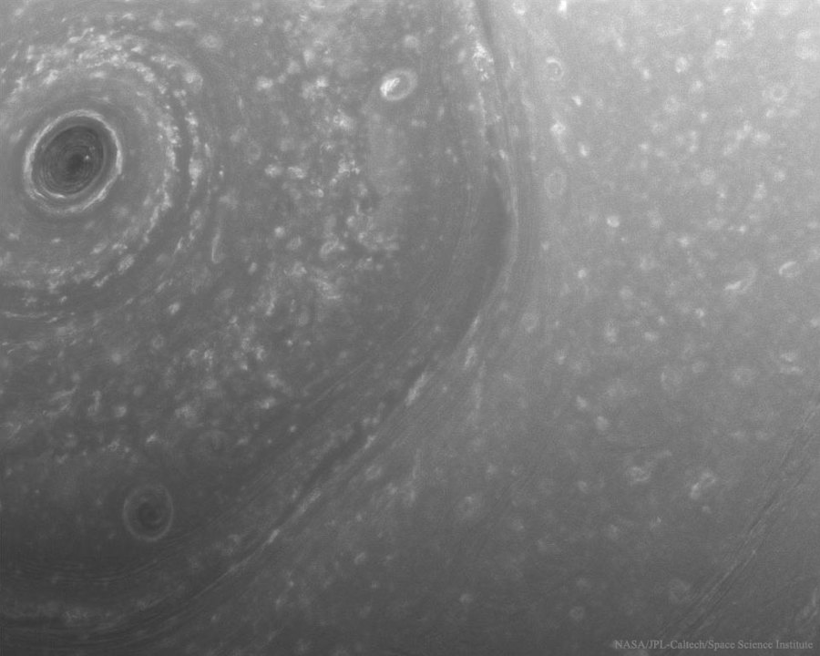 La fotografia es va fer durant la primera de les 20 òrbites d’una setmana de durada de la Cassini al voltant de Saturn. S’hi veu el vòrtex polar central a la part superior esquerra, el límit del núvol hexagonal al centre i nombrosos sistemes de tempestes de color clar arreu.