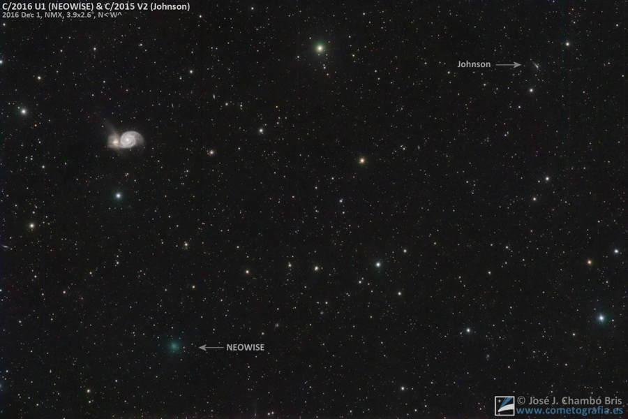 Aquest ampli camp de visió de 4 per 2,5 graus conté dos cometes. D’aspecte diferent, són nous visitants de l’interior del Sistema Solar; actualment són objectes telescòpics tènues que es poden observar molt per damunt de l’horitzó del nord durant el crepuscle del matí. A baix i a l’esquerra hi ha el cometa NEOWISE (C/2016 U1), recentment descobert, que exhibeix una coma rodona i difusa amb la llum verdosa del gas carboni diatòmic irradiada sota la llum solar. La llum solar es reflecteix en la pols de la coma i la cua rabassuda del cometa Johnson (C/2015 V2) que hi ha a la part superior dreta.
