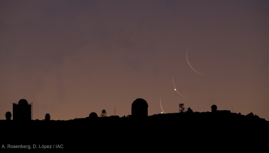 En silueta i contra el crepuscle apareixen les cúpules de l’observatori que hi ha al cim del Teide, a l’illa de Tenerife. El seguit d’exposicions amb teleobjectiu segueix l’ocultació de Venus per la Lluna en tres fotogrames. Lluny de la Terra en la seva òrbita i en una fase gairebé plena, Venus estava il·luminat en un 96 per cent. Prop del perigeu (el màxim l’acostament a la Terra), la fase minvant de la Lluna representa al voltant del 2 per cent del disc lunar sota la llum solar. La brillant estrella del matí apareix en les dues primeres exposicions i s’esvaeix en la tercera fent l’ullet darrere del limbe lunar.